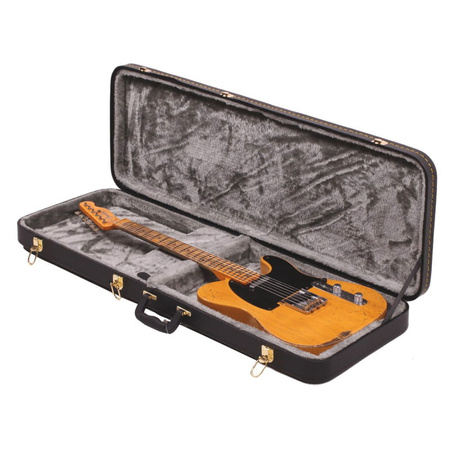 Twardy futerał marki Guardian wykonany z trójwarstwowej sklejki do gitar elektrycznych typu Stratocaster, Telecaster, Superstrat, SG. Zewnątrz obszyty jest czarnym Tolexem, a środek wyłożony miękkim szarym pluszem. Walizka uzbrojona jest w plastikową rączkę oraz złote zawiasy i zamki. W środku znajduje się zamykana skrzynka na akcesoria, która pełni jednocześnie rolę wspornika pod gryf instrumentu dla jego pełnej ochrony.