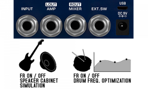 3 opcje wyjściowe: gitara do Lout (L) i perkusja do Rout (R), gitara i perkusja do R / L, gitara i perkusja do R i perkusja do L