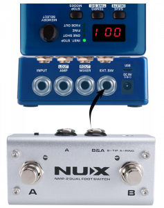 Możesz podłączyć footswitch NUX NMP-2 (sprzedawany oddzielnie) lub inny o tej samej zasadzie działania, aby użyć go jako kontrolera. Możesz przełączać się między presetami w górę i w dół.